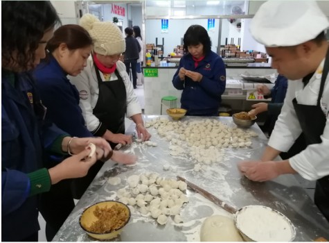 食堂備足了餃子面和美味的肉餡,大家自愿加入到包餃子的隊伍中,大家圍著桌子盤面、搟皮、包餃子,忙的不亦樂乎。